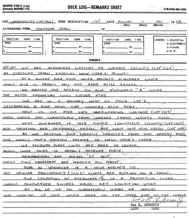 The year 1968 was ushered in by this traditional poetic entry in the ship’s deck log on New Year’s night.